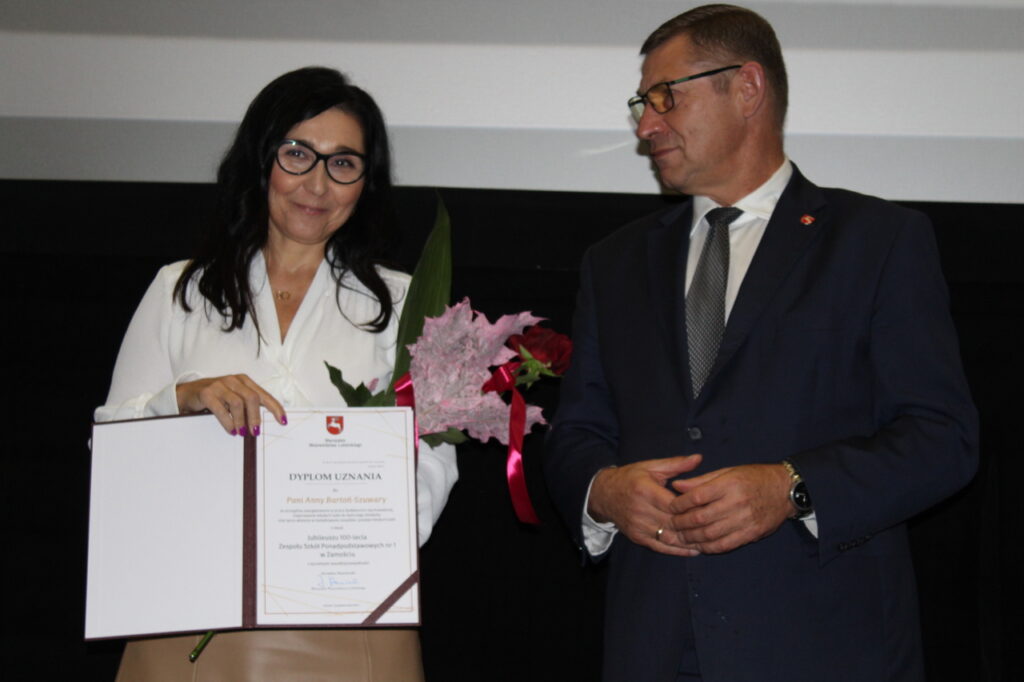 – Wreszcie możemy sfinalizować naszą uroczystość. Jubileusz 100-lecia szkoły obchodzimy w 102. urodziny, ponieważ obchody zostały przesunięte w czasie ze względu na pandemię. Ten dzień jest dla nas bardzo ważny. To czas na wspomnienia i podziękowania oraz spotkania ze znajomymi ze szkolnej ławki. Ten jubileusz to również czas, który poświęcamy na podsumowanie. Nasza szkoła ma wiele osiągnięć, od lat jest w czołówce Lubelskiej Kuźni Talentów. Rozwijamy się, pozyskujemy nowoczesny sprzęt i proponujemy młodzieży nowe, atrakcyjne zawody. Bierzemy też udział w różnego rodzaju projektach, konkursach i programach. Chcemy dalej iść w tym kierunku. Wszystko po to by młodzież mogła się u nas rozwijać i zdobywać nowe umiejętności – powiedziała Sylwia Horoszkiewicz, dyrektor Zespołu Szkół Ponadpodstawowych nr 1 w Zamościu.