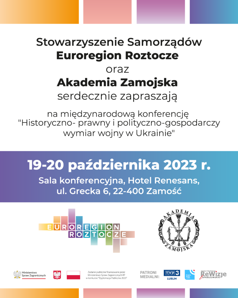 Stowarzyszenie Samorządów Euroregion Roztocze oraz Akademia Zamojska są organizatorami międzynarodowej konferencji „Historyczno-prawny i polityczno-gospodarczy wymiar wojny w Ukrainie”, która odbędzie się 19-20 października 2023 r. w Zamościu.