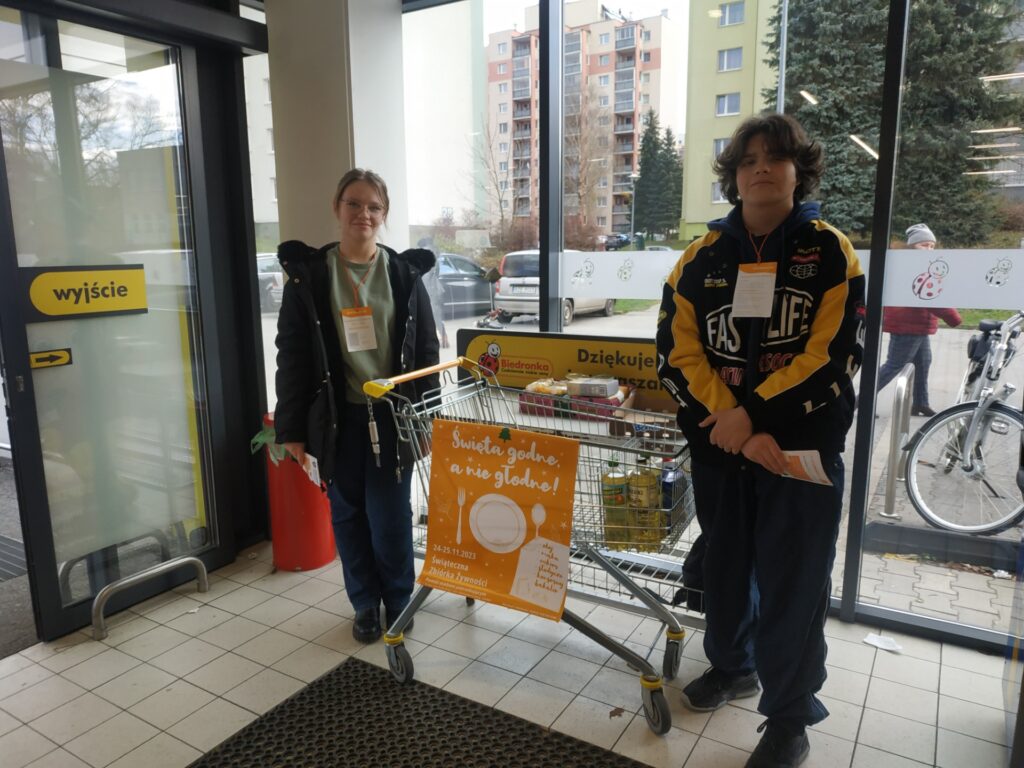 Dzięki zaangażowaniu młodych wolontariuszy zbierających żywność do koszyków na terenie 5 zamojskich marketów Biedronka udało się zgromadzić sporą ilość środków spożywczych o długiej dacie spożycia m.in. kasze, makaron, ryż, słodycze, płatki, herbatę. Zbiórka ta miała na celu wsparcie osób potrzebujących, m.in. podopiecznych Domu Pomocy Społecznej dla Ociemniałych w Żułowie. Część zebranych produktów trafi również do rodzin naszych uczniów żyjących w niedostatku.
