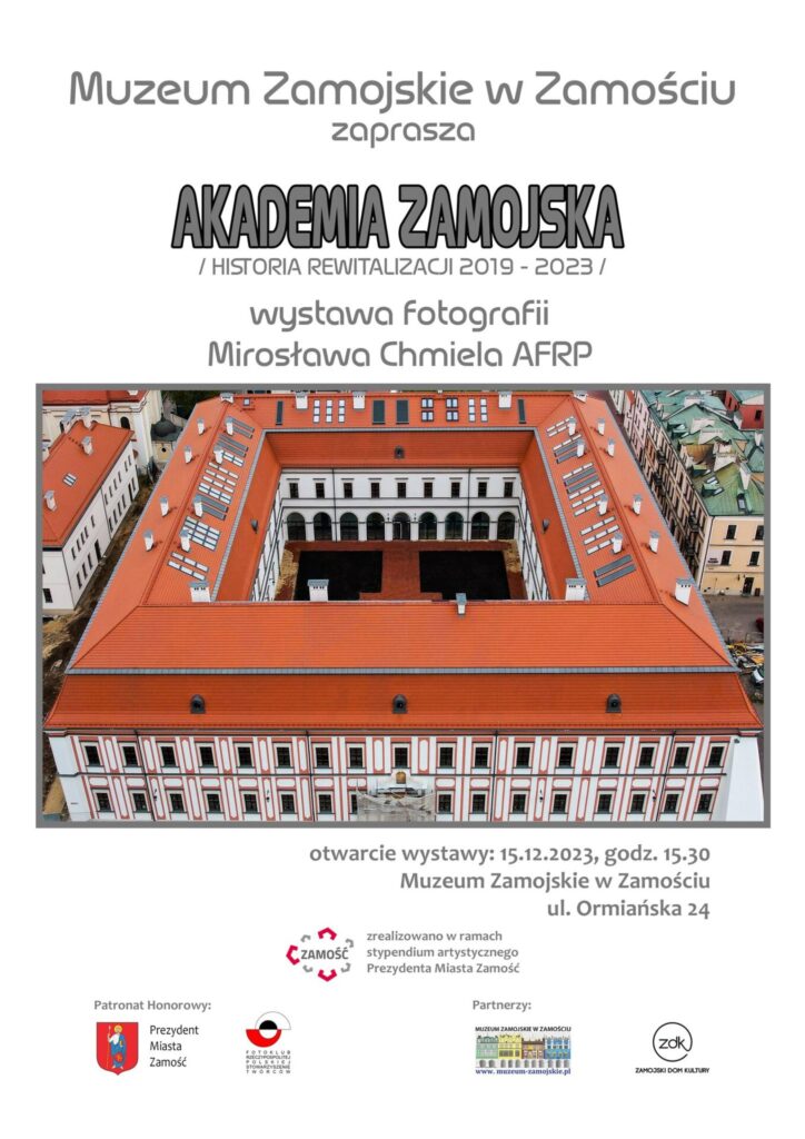 W Muzeum Zamojskim już 15 grudnia 2023 r., o godz. 15:30 odbędzie się uroczyste otwarcie wystawy AKADEMIA ZAMOJSKA /historia rewitalizacji 2019 – 2023/, będącej efektem pracy artystycznej i dokumentacyjnej Mirosława Chmiela, utalentowanego artysty fotografika. Wystawa prezentuje historię rewitalizacji budynku Akademii Zamojskiej, ważnej uczelni założonej w 1594 roku przez Jana Zamoyskiego.