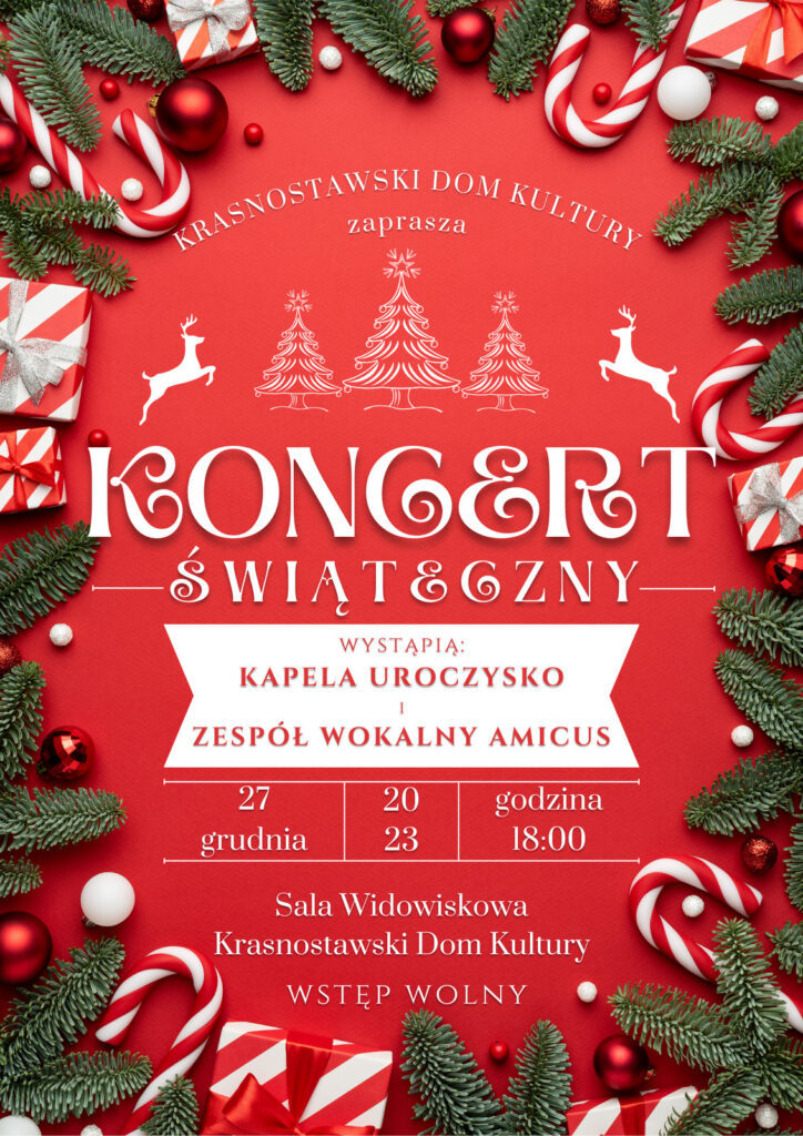 W środę 27 grudnia 2023 r. o godz. 18:00 w Sali Widowiskowej Krasnostawskiego Domu Kultury odbędzie się Koncert Świąteczny, podczas którego wystąpią Kapela „Uroczysko” i Zespół Wokalny „Amicus”.
