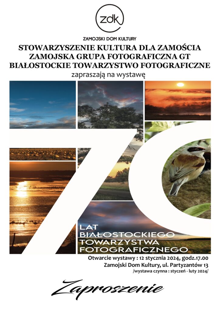 Białostockie Towarzystwo Fotograficzne świętuje 70-lecie swojego istnienia. Z tej okazji organizowana była jubileuszowa wystawa w Białostockim Teatrze Lalek prezentująca dorobek jego członków a obecnie Towarzystwo ma ogromną przyjemność przedstawić część prac z jubileuszowej wystawy w Zamojskim Domu Kultury.