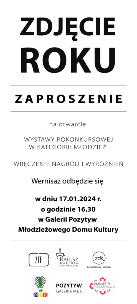 Zamojskie Towarzystwo Fotograficzne, Zamojski Dom Kultury, Młodzieżowy Dom Kultury oraz Galeria Pozytyw serdecznie zapraszają wszystkich miłośników fotografii na uroczyste otwarcie wystawy pokonkursowej Zdjęcie Roku 2023 w kategorii „Młodzież”. Wernisaż, podczas którego zostaną wręczone nagrody i wyróżnienia, odbędzie się w najbliższą środę, tj. 17 stycznia o godzinie 16:30 w Galerii Pozytyw Młodzieżowego Domu Kultury.