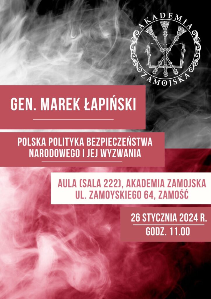 Akademia Zamojska zaprasza na wykład generała Marka Łapińskiego, byłego szefa Służby Wywiadu Wojskowego, pt. „Polska polityka bezpieczeństwa narodowego i jej wyzwania”, który rozpocznie się 26 stycznia br. o godz. 11.00 w Auli (Sala 222), ul. Zamoyskiego 64, Zamość.