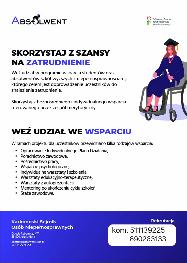 Karkonoski Sejmik Osób Niepełnosprawnych zaprasza do udziału w programie wsparcia dla studentów oraz absolwentów szkół wyższych z niepełnosprawnościami, którego celem jest doprowadzenie uczestników do zatrudnienia.