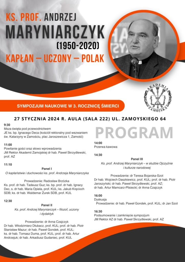 Akademia Zamojska zaprasza na sympozjum pt. Kapłan – Uczony – Polak, poświęcone śp. ks. prof. dr. hab. Andrzejowi Maryniarczykowi SDB – wybitnemu filozofowi, profesorowi Wydziału Filozofii Katolickiego Uniwersytetu Lubelskiego Jana Pawła II, uczniowi i następcy o. prof. Mieczysława Alberta Krąpca OP, długoletniemu kierownikowi Katedry Metafizyki KUL, założycielowi i prezesowi Società Internazionale Tommaso d’Aquino, redaktorowi naczelnemu Powszechnej encyklopedii filozofii i Encyklopedii filozofii polskiej, autorowi licznych artykułów naukowych i monografii, organizatorowi konferencji i sympozjów.