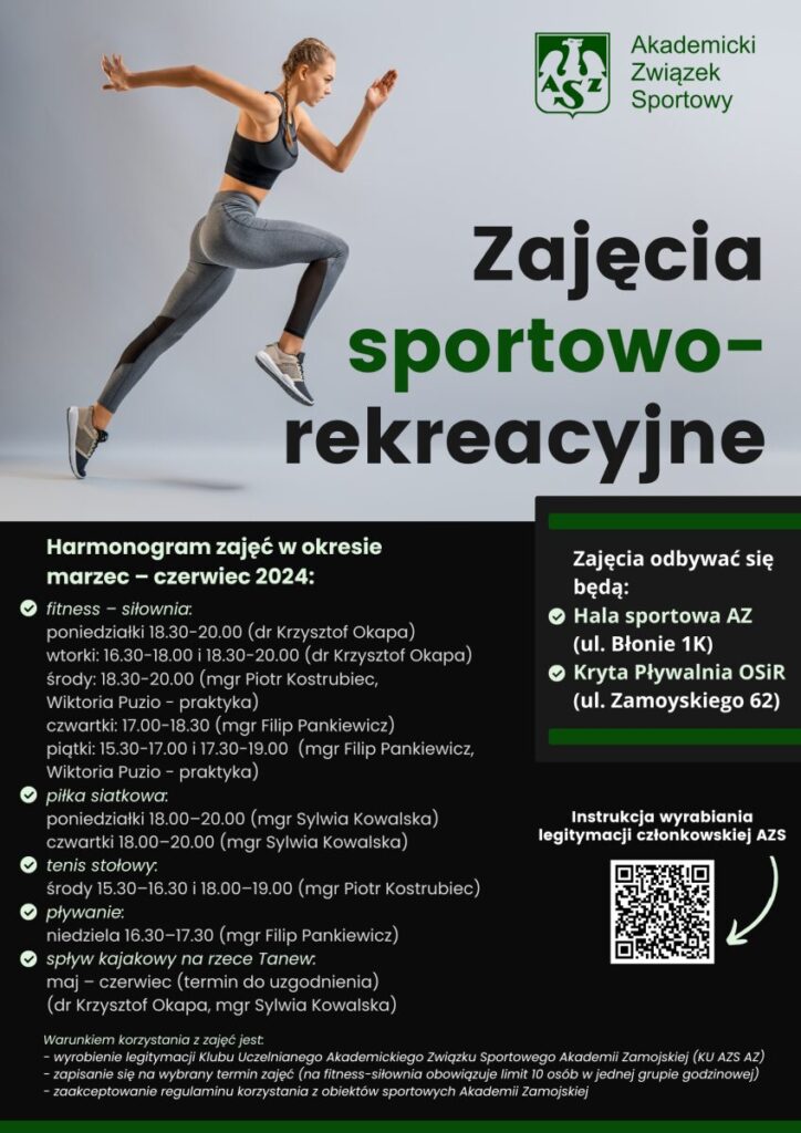 Akademia Zamojska zaprasza studentów i pracowników na zajęcia sportowo-rekreacyjne.
