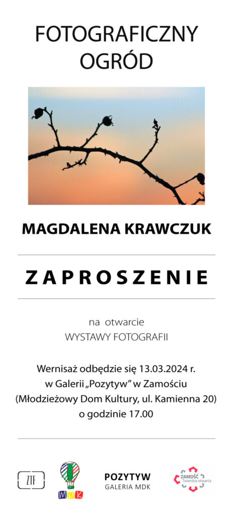 Młodzieżowy Dom Kultury w Zamościu, Galeria Fotografii Pozytyw oraz Zamojskie Towarzystwo Fotograficzne serdecznie zapraszają na pierwszą indywidualną wystawę fotograficzną Magdaleny Krawczuk, pt. Fotograficzny ogród. Wernisaż odbędzie się w najbliższą środę, tj. 13 marca 2024r. o godzinie 17:00 w Galerii Fotografii Pozytyw mieszczącej się w Młodzieżowym Domu Kultury przy ul. Kamiennej 20 w Zamościu.