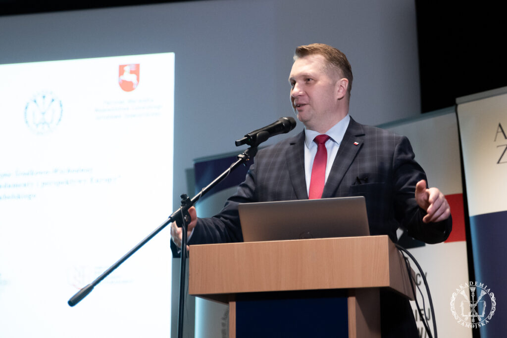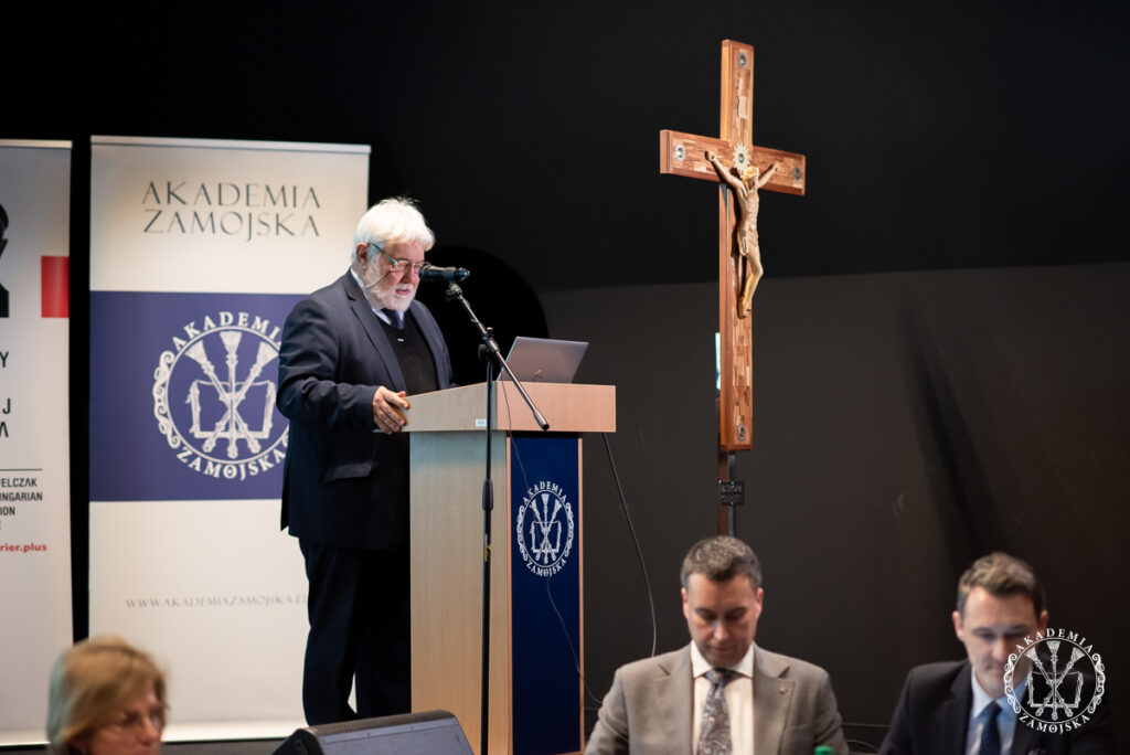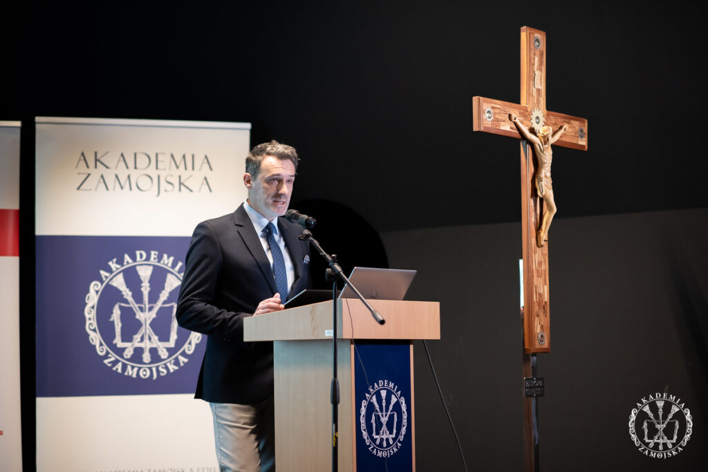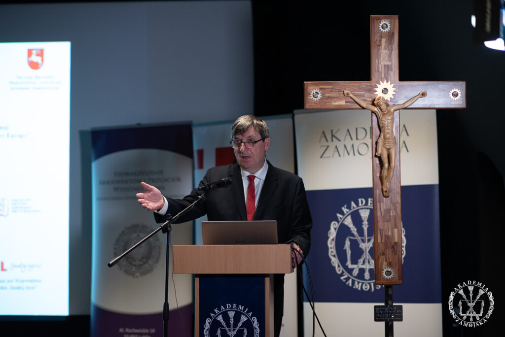 Europa była i jest miejscem formacji na miarę nie tylko ludzkiej natury, ale i celu ludzkiego życia. Dziś jest ogromna potrzeba przypominania i pokazywania działań, które umacniają autentyczną tożsamość europejską. Z perspektywy historycznej ta tożsamość opiera się na czterech elementach: trwałej rodzinie; poszanowaniu ludzkiej pracy, która daje nam dobrobyt i likwiduje instytucje niewolnictwa; obecności prawa w życiu publicznym, które wprowadza relacje społeczne między ludźmi sprawiedliwość; po czwarte na autonomii osoby ludzkiej – mówił rektor Akademii Zamojskiej dr hab. Paweł Skrzydlewski, prof. AZ. – Idea zrównoważonego rozwoju może być czytana na wiele różnych sposobów. Sam rozwój jest czymś dobrym, ponieważ wiąże się z doskonaleniem człowieka i życia społecznego, a także z rozwojem strony materialnej i technicznej. Czym innym jest ideologia zrównoważonego rozwoju, która często lansuje w życiu społecznym kwestie jak tzw. „Zielony Ład”, zeroemisyjność, politykę praw reprodukcyjnych, czy szereg różnych zagrożeń, które niestety nie mają nic wspólnego z autentycznym rozwojem – tłumaczył dr hab. Paweł Skrzydlewski, prof. AZ.