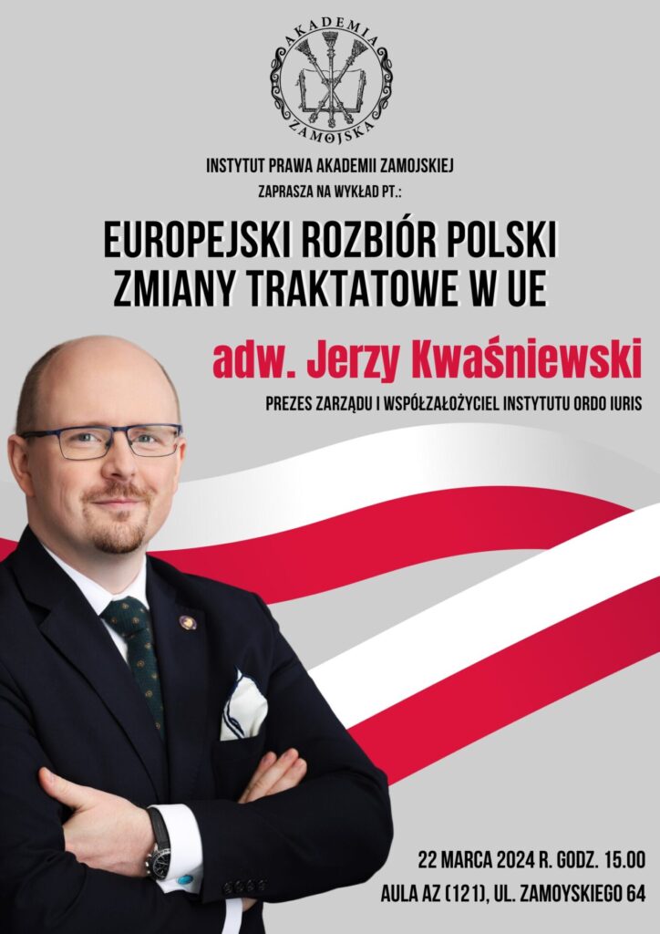Instytut Prawa Akademii Zamojskiej zaprasza na wykład otwarty pt. „Europejski rozbiór Polski – zmiany traktatowe w UE”, który wygłosi prezes zarządu i współzałożyciel Instytutu Ordo Iuris adw. Jerzy Kwaśniewski.
