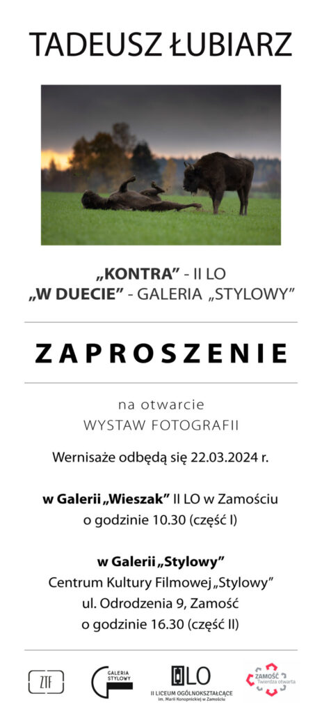 Zamojskie Towarzystwo Fotograficzne, Galeria Fotografii Stylowy oraz II Liceum Ogólnokształcące w Zamościu serdecznie zapraszają na dwie wystawy fotograficzne Tadeusza Łubiarza, pt. „W duecie” i „Kontra”.