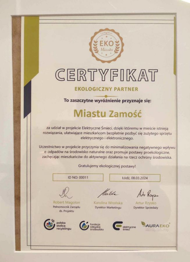 – „Medal z recyklingu elektrycznych śmieci to swoistego rodzaju podziękowanie dla Miasta i jego mieszkańców za proekologiczną postawę w projekcie Elektryczne Śmieci, ale także w Programie Polska Stolica Recyklingu. Tym razem nie udało się zdobyć głównej nagrody, ale chcę szczególnie podziękować mieszkańcom Zamościa za ich proekologiczną postawę i zaangażowanie w selektywną zbiórkę elektrycznych śmieci”– podsumowuje Kinga Rodkiewicz z Fundacji Odzyskaj Środowisko.