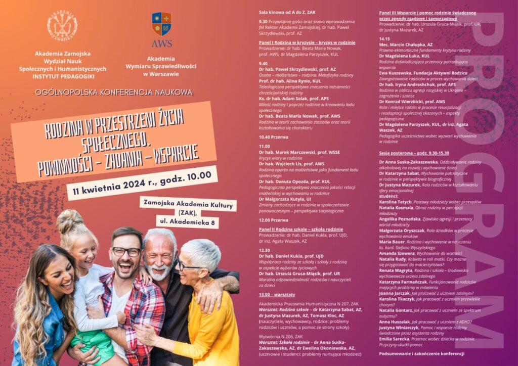 11 kwietnia 2024 roku w Zamojskiej Akademii Kultury odbędzie się konferencja „Rodzina w przestrzeni życia społecznego. Powinności – zadania – wsparcie” organizowana przez Instytut Pedagogiki Akademii Zamojskiej i Akademię Wymiaru Sprawiedliwości w Warszawie.