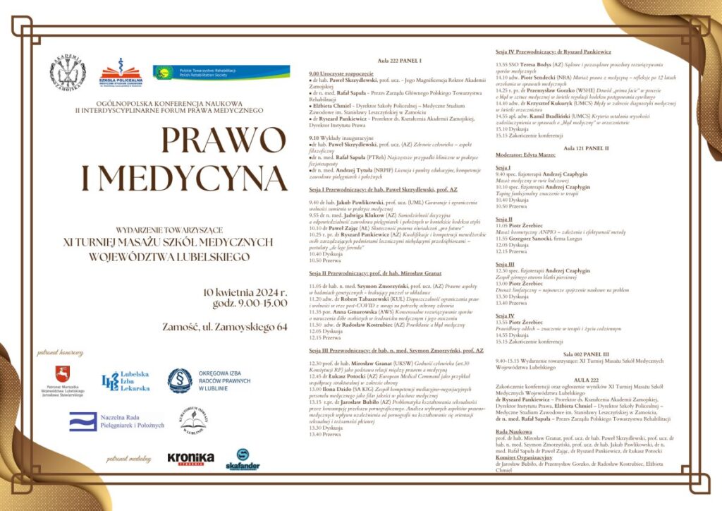 Wystąpią m.in.: dr hab. Paweł Skrzydlewski, prof. ucz. (AZ), Zdrowie człowieka – aspekt filozoficzny; dr n. med. Rafał Sapuła (PTReh) Najczęstsze przypadki kliniczne w praktyce fizjoterapeuty; dr hab. Jakub Pawlikowski, prof. ucz. (UML), Gwarancje i ograniczenia wolności sumienia w praktyce medycznej; adw. dr Robert Tabaszewski (KUL) Dopuszczalność ograniczania praw i wolności w erze post-COVID z uwagi na potrzebę ochrony zdrowia; por. Anna Gmurowska (AWS) Konsensualne rozwiązywanie sporów o naruszenia dóbr osobistych w środowisku medycznym i jego otoczeniu; adw. Piotr Sendecki (NRA) Mariaż prawa z medycyną – refleksje po 12 latach orzekania w sprawach medycznych.