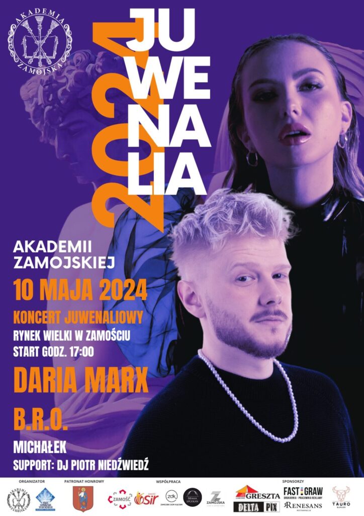 Znamy już artystów, którzy wystąpią 10 maja br. na koncercie juwenaliowym Akademii Zamojskiej. Będzie trochę popu, trochę rocka a przed publiką zaprezentują się Daria Marx, B.R.O i zespół Michałek. Jako suport zagra DJ Piotr Niedźwiedź, student Akademii Zamojskiej.