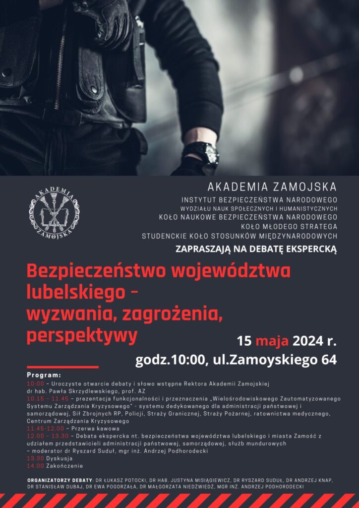 Instytut Bezpieczeństwa Narodowego Akademii Zamojskiej oraz Koło Młodego Stratega, Studenckie Koło Stosunków Międzynarodowych, Koło Naukowe Bezpieczeństwa Narodowego zapraszają na seminarium Bezpieczeństwo województwa lubelskiego – wyzwania, zagrożenia, perspektywy”.