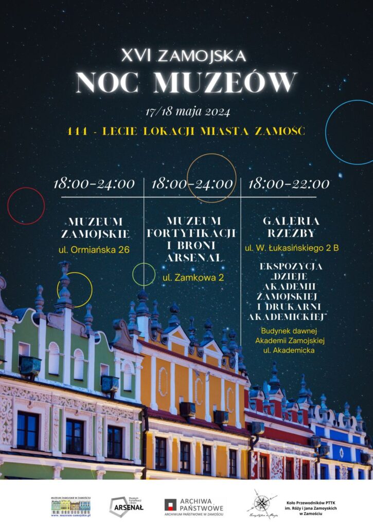 XVI Zamojska Noc Muzeów odbywać się będzie pod hasłem „444 – lecie lokacji miasta Zamość”. Tematami przewodnimi będą najcenniejsze i najważniejsze dokumenty w historii miasta, dzieje Akademii Zamojskiej i jej drukarni oraz inne zabytki Zamościa. Wspólnie z Archiwum Państwowym w Zamościu zaprezentowane zostaną dokumenty, które odegrały fundamentalną rolę w powstaniu i rozwoju miasta. W Muzeum Zamojskim po raz pierwszy zostanie zaprezentowany przez Archiwum akt lokacyjny Zamościa Jana Zamoyskiego z 10 kwietnia 1580 roku, obok przechowywanego w Muzeum jego potwierdzenia wydanego przez króla Stefana Batorego 12 czerwca 1580 roku. Ponadto, na stałej ekspozycji „Dzieje Akademii Zamojskiej i drukarni akademickiej” w Zamojskiej Akademii Kultury, będzie można zobaczyć, jak funkcjonowała XVII-wieczna drukarnia. Podobnie, jak w latach poprzednich zapraszamy również na tematyczne zwiedzanie zespołu staromiejskiego „Śladami najstarszego planu Zamościa” z zamojskimi przewodnikami. W tym roku trasa zwiedzania pozwoli na zapoznanie się z obiektami ujętymi na najstarszym planie miasta tzw. Planie Georga Brauna wydanym w Kolonii w 1618 roku.