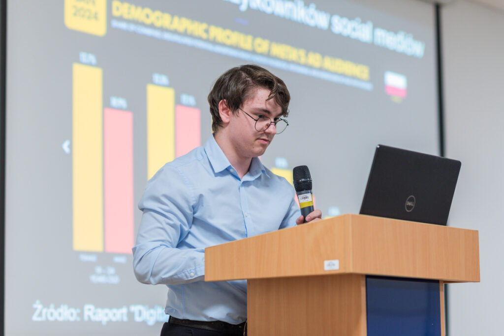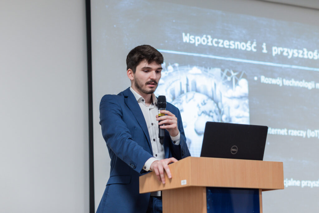 Sebastian Kukawski (student I roku kierunku finanse i rachunkowość) wystąpił z tematem „Sieć internet – wczoraj i dziś”. Pdkreślił, że Internet jako jeden z najważniejszych wynalazków współczesnych czasów, zmienił na zawsze sposób, w jaki się komunikujemy, pracujemy i żyjemy. Od skromnych początków jako projekt badawczy, internet przekształcił się w globalną sieć łączącą miliardy urządzeń i ludzi na całym świecie. Rozwój Internetu przyniósł liczne korzyści, ale także wyzwania, takie jak bezpieczeństwo i prywatność danych.