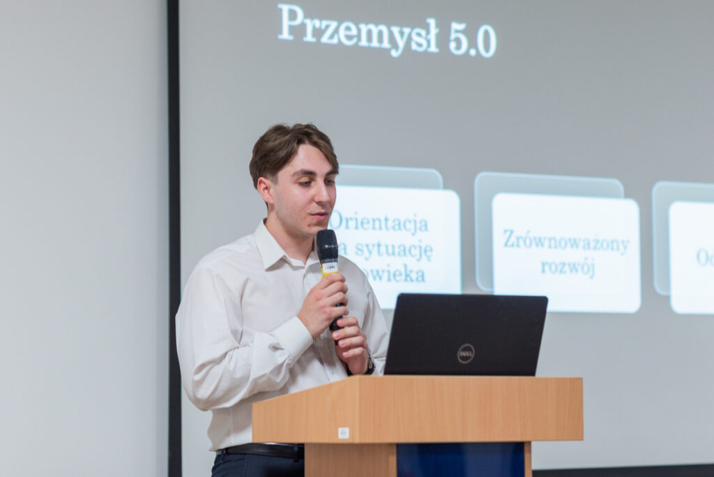 Tymon Matuszak (student I roku FiR) przybliżył temat „Przełomowych technologii w praktyce – w zakresie wykorzystywanych narzędzi”. Odosząc się do „5” rewolucji przemysłowej Tymon podkreślił, że to dopiero przyszłościowy postulat, a nowa wizja branży produkcyjnej powinna być silnie osadzona w kontekstach społecznym, środowiskowym i politycznym, opierając się na trzech filarach: orientacji na sytuację człowieka, zrównoważonego rozwoju oraz odporność.