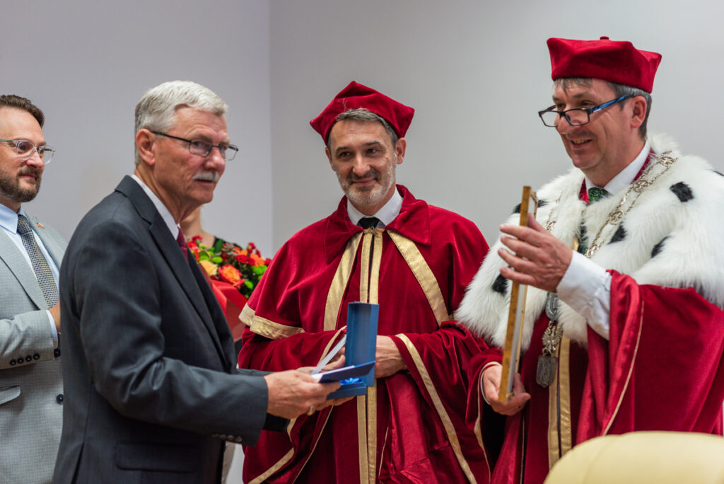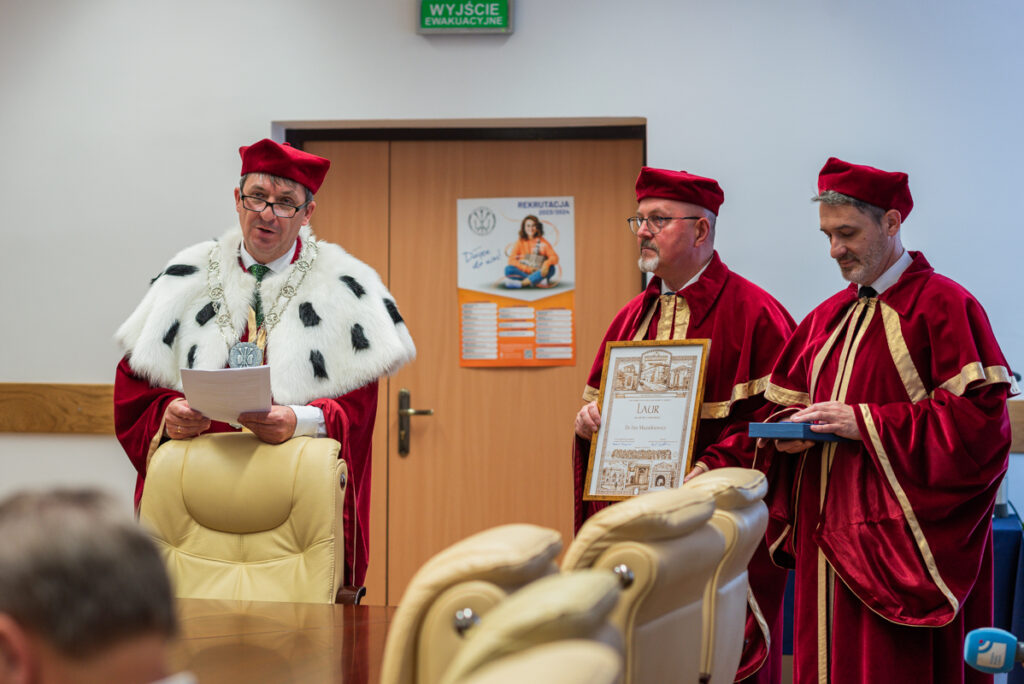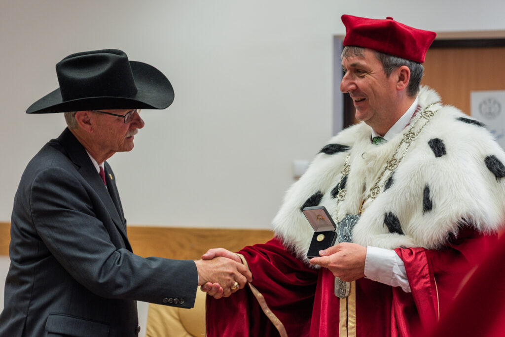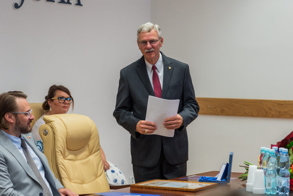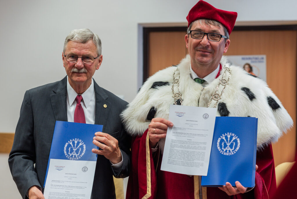 – Jim Mazurkiewicz to przedsiębiorca i profesor, który zaproponował naszej Akademii współpracę na płaszczyźnie zarówno studiów, jak też pewnych działań ekonomicznych. Cieszy nas to ogromnie, ponieważ Polonia w Teksasie jest bardzo liczna. Nasza współpraca może obejmować kierunki medyczne, jak też nauki związane z dziedziną bezpieczeństwa.  Ta współpraca ma obejmować tworzenie studiów binarnych  i będzie wiązać się z przyjazdami studentów i naukowców z Teksasu, jak również kadry naukowej i studentów naszej Akademii do Stanów Zjednoczonych. Jako jeden z pierwszych został on doceniony Laurem Akademii Zamojskiej. To wyróżnienie dla osób, które wspierają prace naszej Akademii – mówił rektor Akademii Zamojskiej dr hab. Paweł Skrzydlewski, prof. ucz., który wręczył okolicznościowy laur amerykańskiemu wykładowcy o polskich korzeniach.