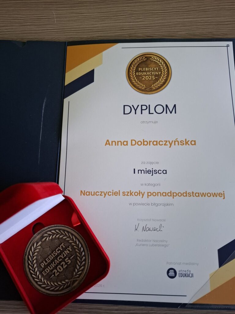 Wśród wyróżnionych pedagogów znalazła się Anna Dobraczyńska z I LO im. ONZ w Biłgoraju, która zdobyła I miejsce w powiecie biłgorajskim w kategorii Nauczyciel szkoły ponadpodstawowej. To prestiżowe wyróżnienie jest wyrazem uznania zarówno dla jej codziennej pracy dydaktycznej, jak i zaangażowania w rozwój uczniów.