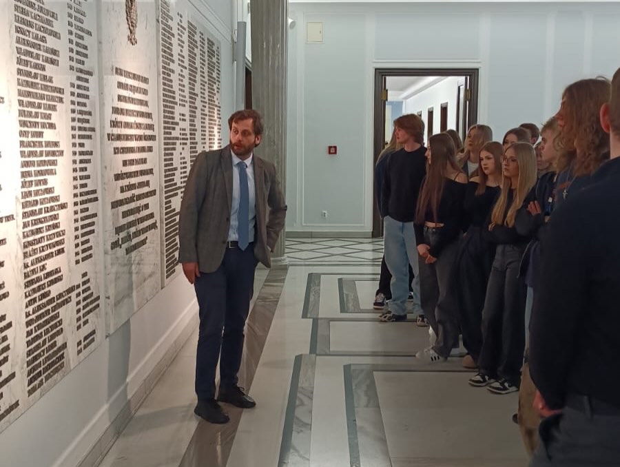 Pod opieką przewodnika młodzież miała okazję przejść sejmowymi korytarzami i poznać bogatą historię jednego z najważniejszych miejsc w Polsce. W trakcie wizyty uczniowie zobaczyli z galerii dla publiczności główną Salę Posiedzeń Sejmu, a także kuluary, hol główny z makietami budynków, Salę Kolumnową im. Kazimierza Pużaka oraz inne historyczne wnętrza.