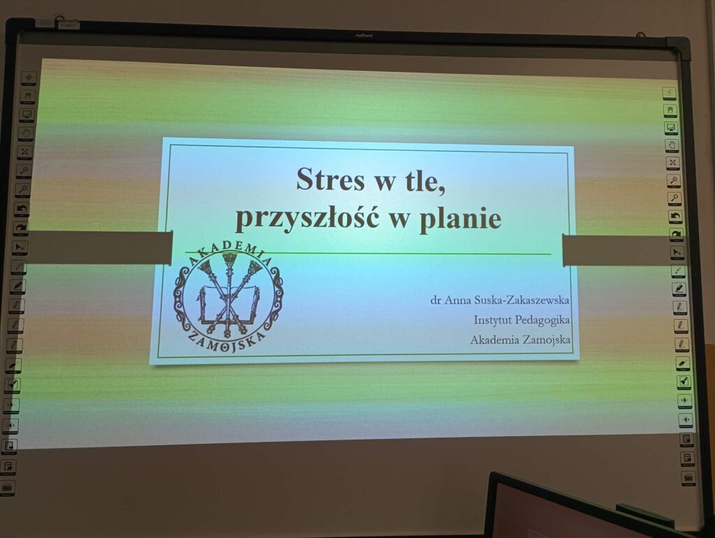 15 kwietnia br. uczniowie klas V Technikum nr 1 przy Zespole Szkół Ponadpodstawowych nr 1 w Zamościu wzięli udział w zajęciach pt.: „Stres w tle, przyszłość w planie”. Spotkanie poprowadziła dr Anna Suska-Zakaszewska z Instytutu Pedagogiki Akademii Zamojskiej.