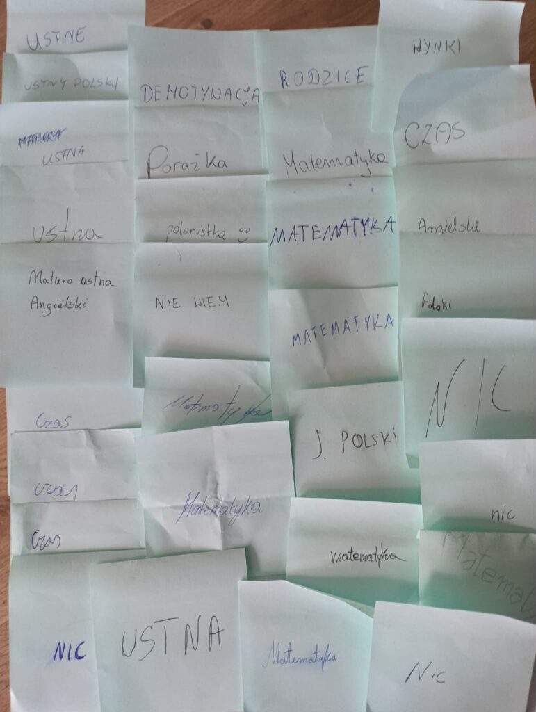 Uczniowie poznali także strategie radzenia sobie ze stresem w trakcie egzaminu, w tym technikę „uziemienia”, polegająca na skupieniu uwagi na bodźcach z otoczenia (np. tym, co można zobaczyć, usłyszeć czy dotknąć), co pomaga opanować napięcie i odzyskać kontrolę nad emocjami. W trakcie zajęć młodzież wzięła udział w grze „Wygrywam ze stresem”, która umożliwiła praktyczne przećwiczenie poznanych metod.